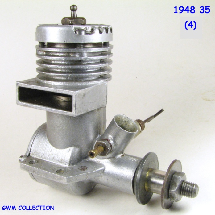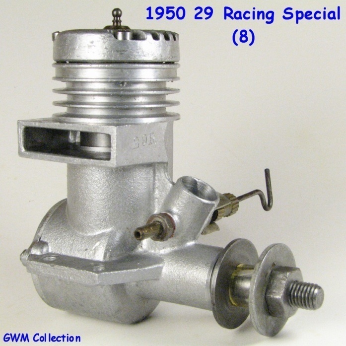 The .35, .800 x .700 B/S, was very successful and in late 1949 1950 a 29 was marketed. This was a .35 with a .smaller bore, 738 x .700 B/S. A 29 Racing Special was sold in 1950 (8) that was a 29 with handwork of the crankshaft, case, liner porting, and a meehanite crankshaft bushing. Externally, the engine has 29R stamped on the front of the exhaust stack. |