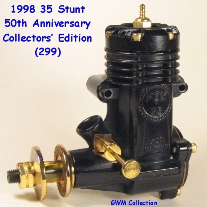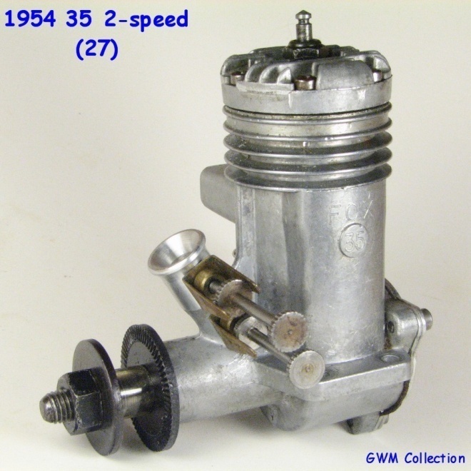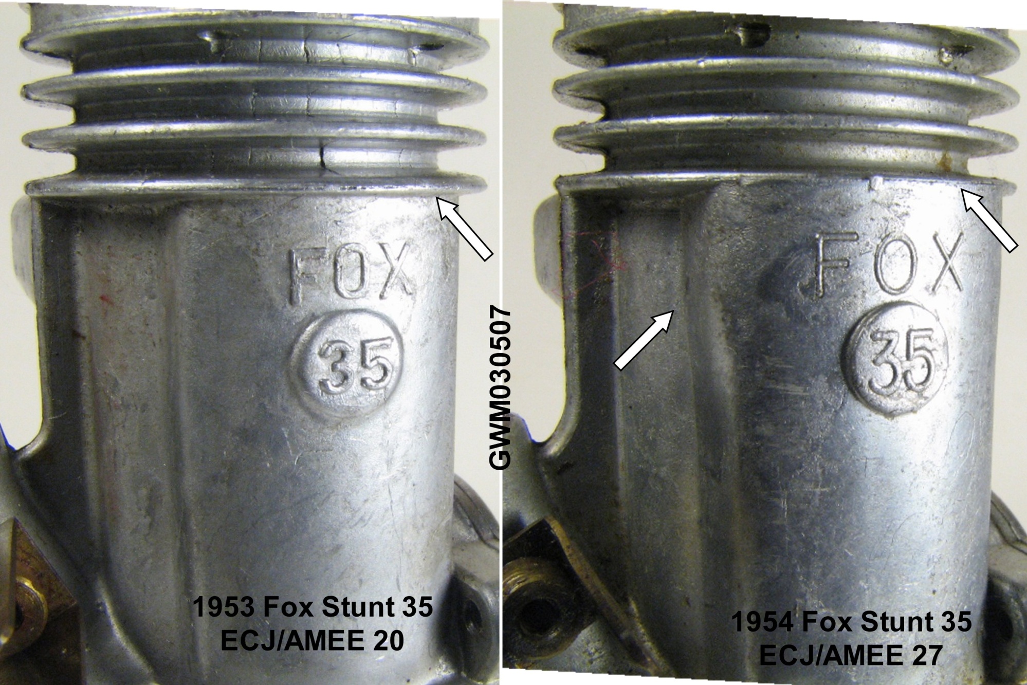 One of the most famous model airplane engines ever made, the Fox 35 Stunt originated in 1948 (4). Universally called Sandcast engines, the first 35's were actually cast in ferrous permanent molds. The first 35 was made by Fox Engineering Labs (Duke Foxs garage). It had as-cast cylinder fins, head bolt bosses between the top 2 cylinder fins, 4 bolt head, 2 bolt rear cover, and no web between the venturi and the cylinder. A universal Austincraft NVA was used.