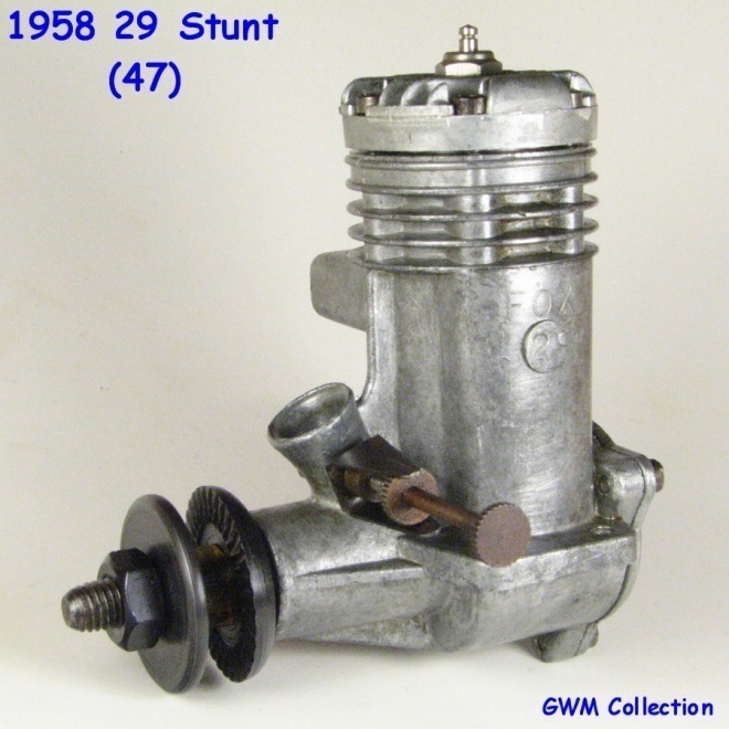 Another major case change came in 1958. Stiffening bosses were added between the cylinder fins. A thick black prop nut and thrust washer were introduced. And, as since 1950, a 29 version was still sold (47) although this was the last 29 Stunt. Interestingly, the 29 and 35 werent advertised as Stunt engines until this year. |