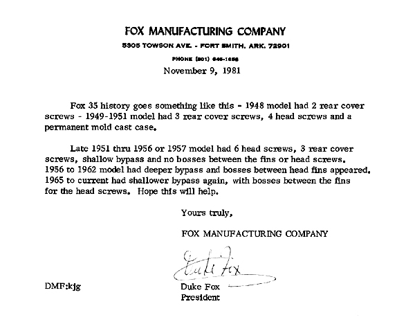 In 1954 the O&R thrust washer was replaced with a thin blackened steel Fox design. The bypass was deepened, now flush with the lower cooling fin and the font on the 35 was changed. |