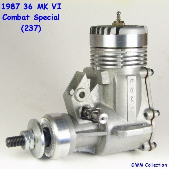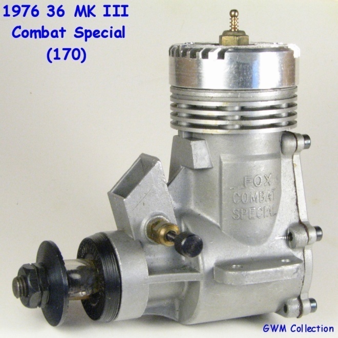 | Continuing his long line of Combat Special Engines, Fox introduced the 36 MK III Combat Special (170), .800 x .715 B&S in 1976. It utilized schneurle porting, a 2 piece button head design, lapped iron piston, the 6 bolt high rear cover style case, and a twin BB crankshaft. Fox Combat Special was cast on the bypass. A .29 version was also available, 29 stamped on top of the left mounting lug. Unique this year, the 29 had a .730 x .715 B&S thus the 36's crankshaft could be used, not a special 29 crank. | ![]() |