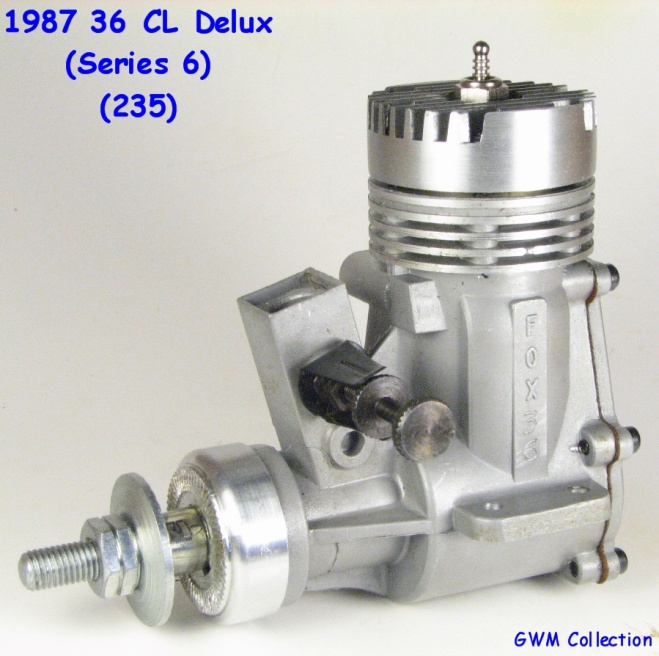 | The case was again modified in 1987 to use twin BBs and a vertical nameplate was cast on the bypass. FOX over 36 or 40 was stamped on the nameplate. The delivery of the special front BB was delayed and to get the engines on the market, Fox turned down the front bearing housing and ran the crankshaft in the case material at the front and a single rear BB. Collectors call these engines the Series 5½. RC versions are not known. The 36 (233) is shown. | ![]() |
